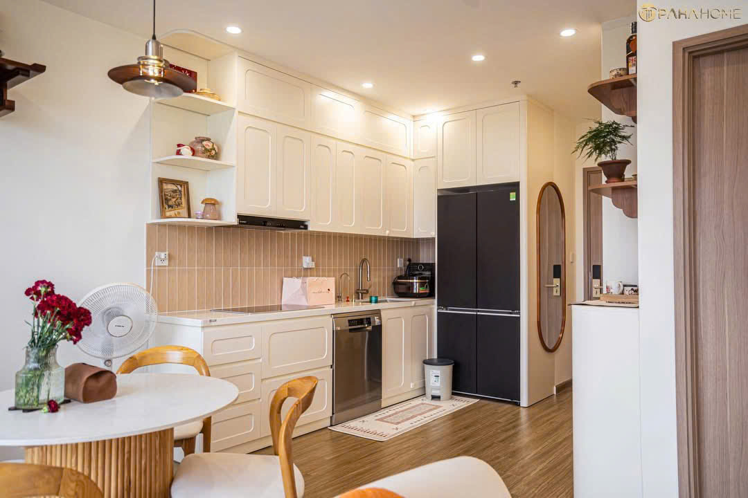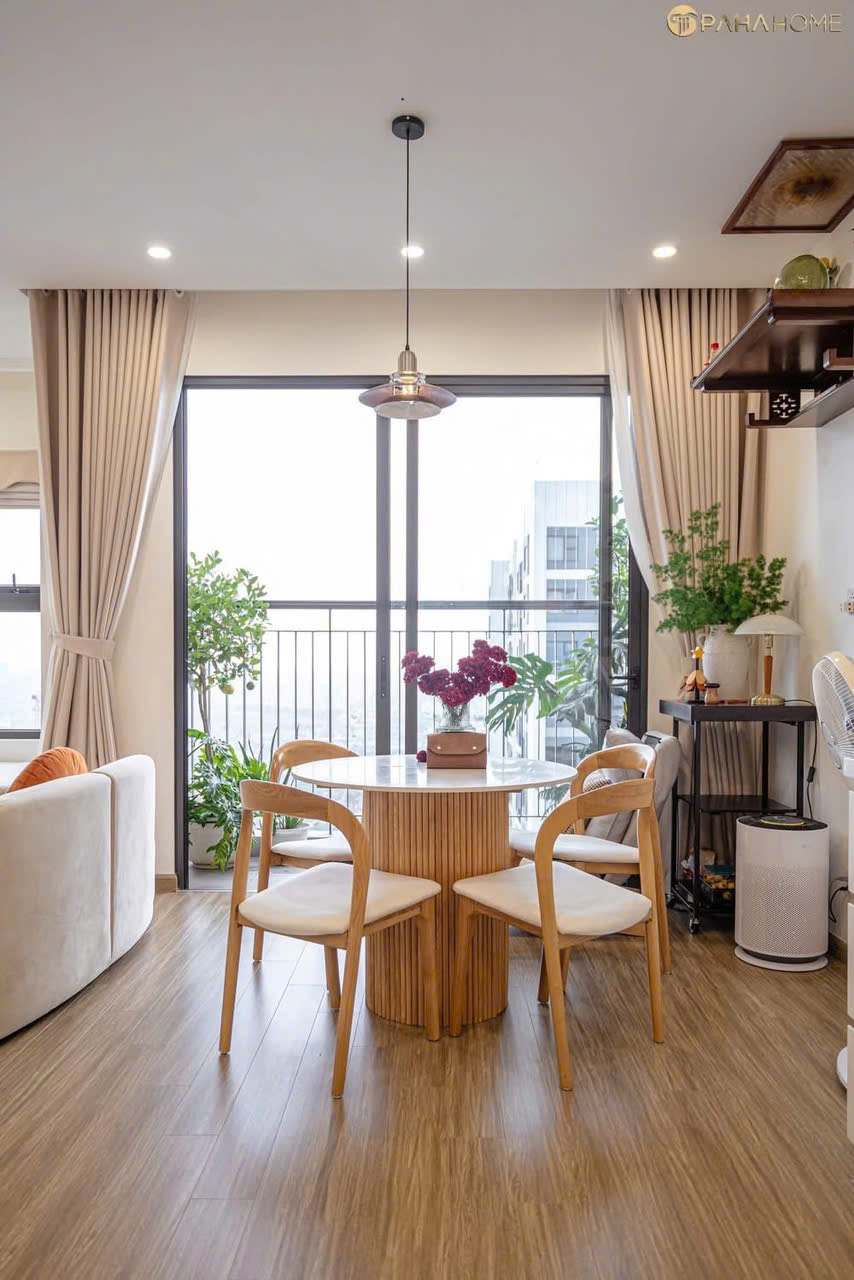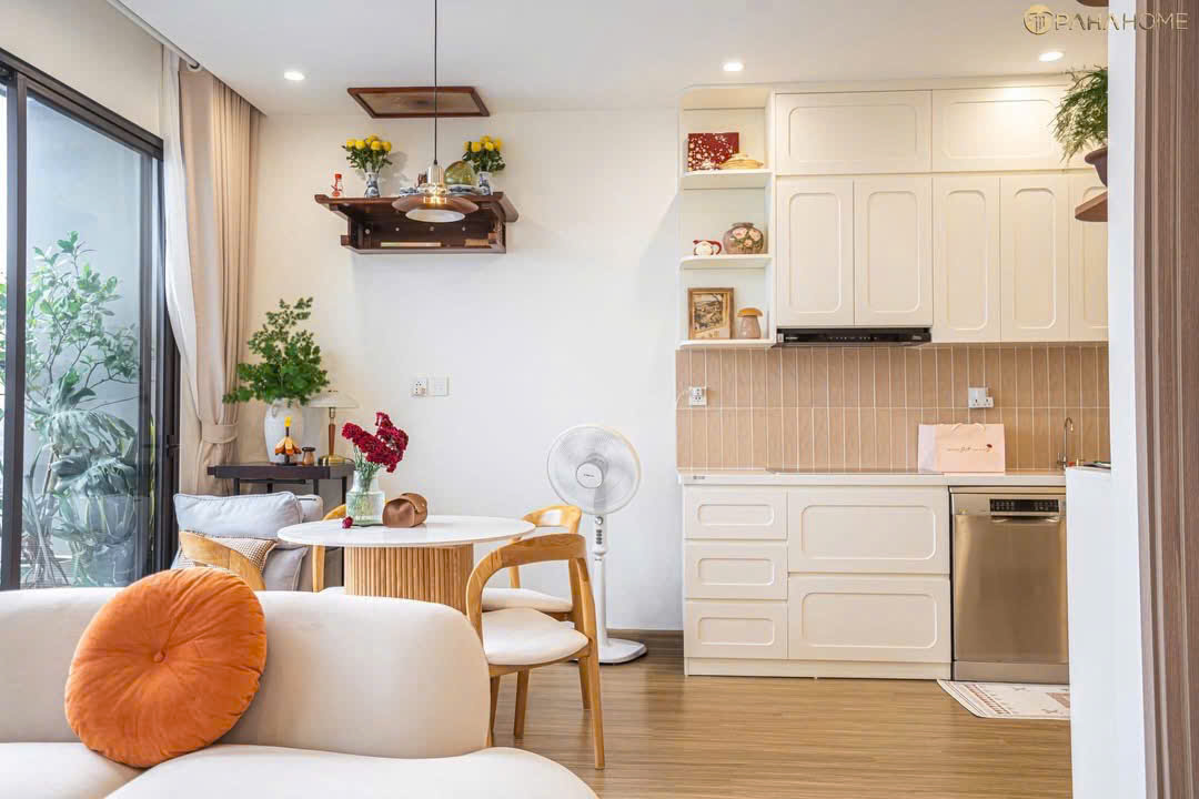 Khu vực sinh hoạt chung được thiết kế theo lối không gian mở, đón trọn ánh sáng tự nhiên từ ban công rộng thoáng. Tâm điểm là bộ sofa hạt đậu bo cong mềm mại phối cùng bàn ăn tròn thanh lịch, tạo nên luồng giao thông linh hoạt và cảm giác kết nối vô hình giữa các thành viên. Hệ tủ bếp kịch trần với đường phào chỉ tinh tế không chỉ tối ưu hóa không gian lưu trữ mà còn đóng vai trò như một mảng tường trang trí sang trọng, sạch sẽ.