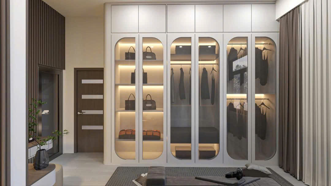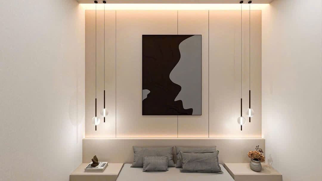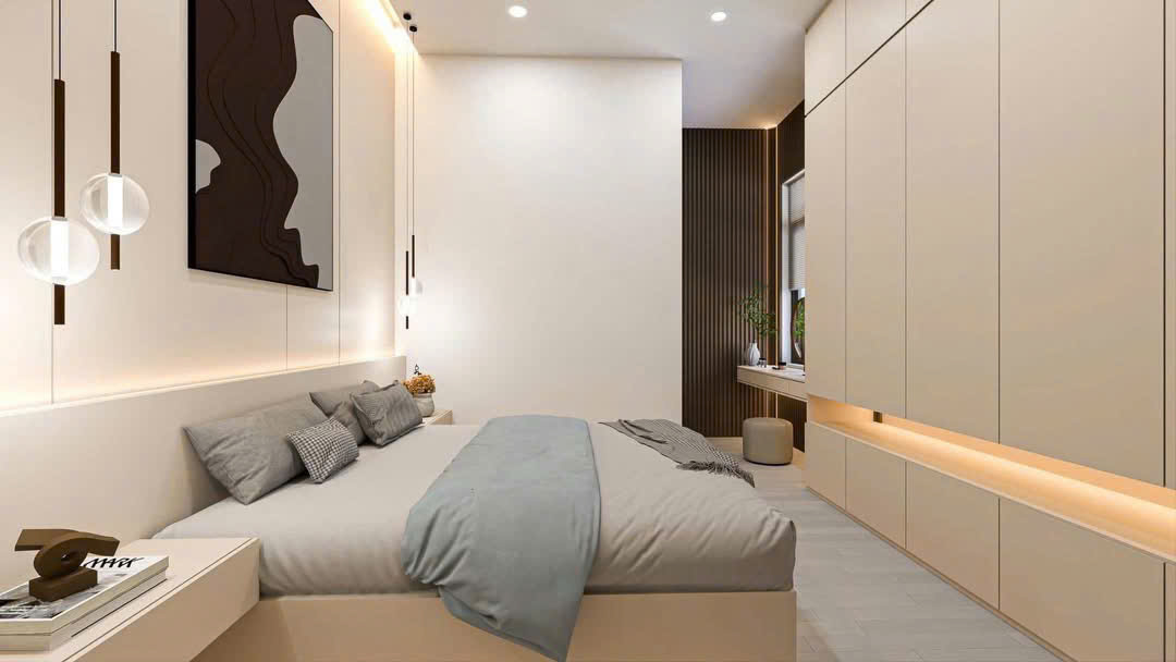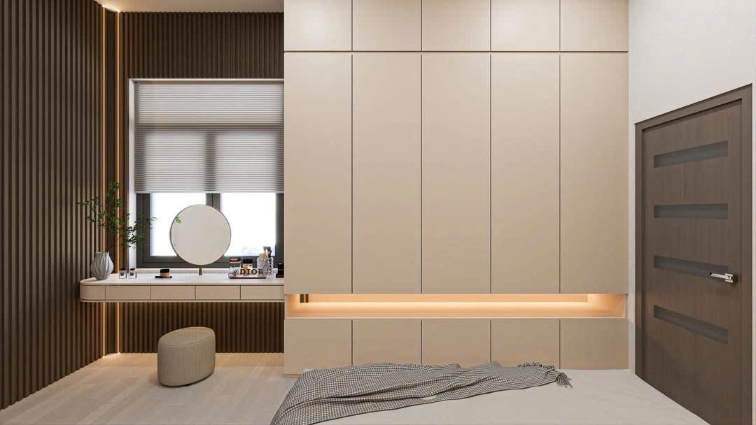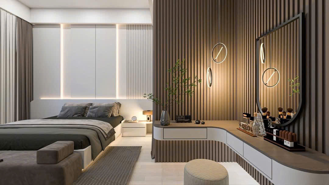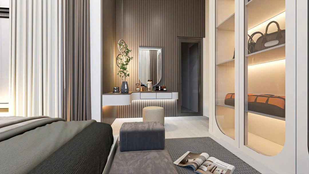 Bước vào không gian phòng ngủ, sự tiện nghi được đặt lên hàng đầu với hệ tủ âm tường kịch trần, bàn trang điểm tinh gọn kết hợp cùng vách ốp nan gỗ dọc hiện đại. Màu sắc trung tính chủ đạo phối hợp nhịp nhàng với ánh sáng vàng ấm, mang lại cảm giác yên bình và thư thái tuyệt đối sau một ngày làm việc mệt mỏi.