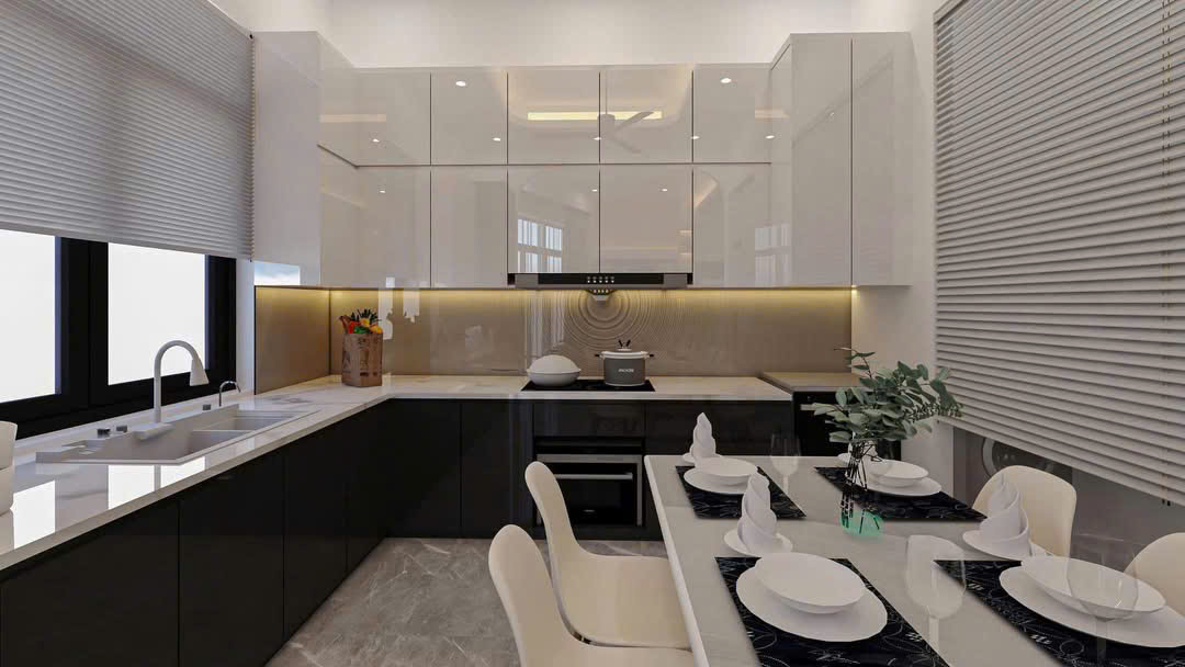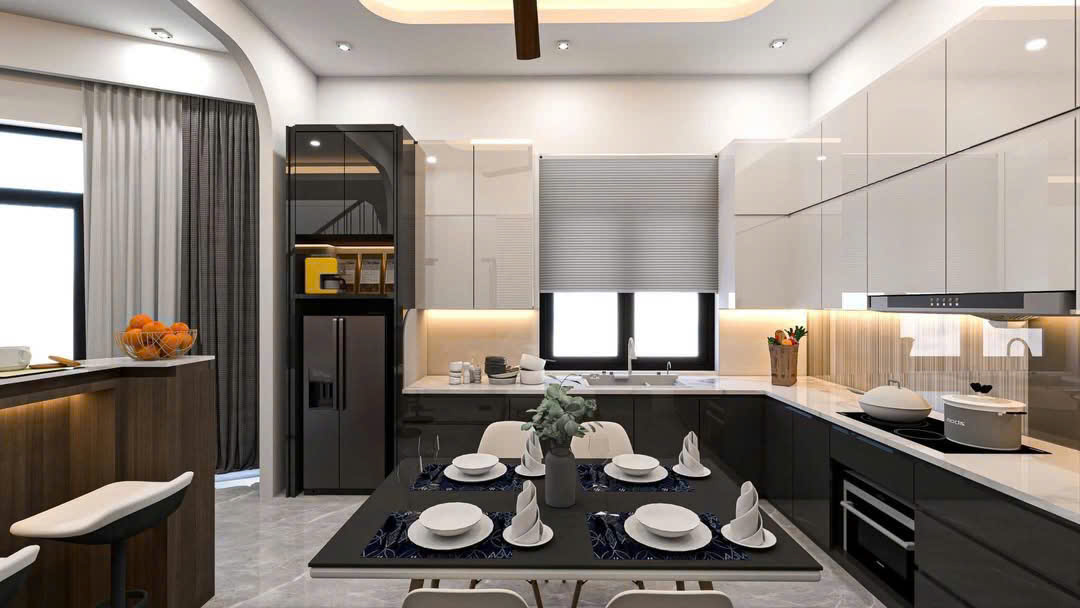Trong không gian phòng khách và bếp, sự kết hợp giữa các mảng tường ốp gỗ trầm ấm, hệ tủ cánh kính sang trọng và đá Marble cao cấp tạo nên một diện mạo vô cùng đẳng cấp. Hệ thống chiếu sáng được thiết kế đa lớp, từ đèn thả nghệ thuật độc bản đến đèn led âm trần, không chỉ soi sáng mà còn đóng vai trò quan trọng trong việc tôn vinh vẻ đẹp của vật liệu và tạo ra chiều sâu cho căn nhà vào mỗi buổi đêm.