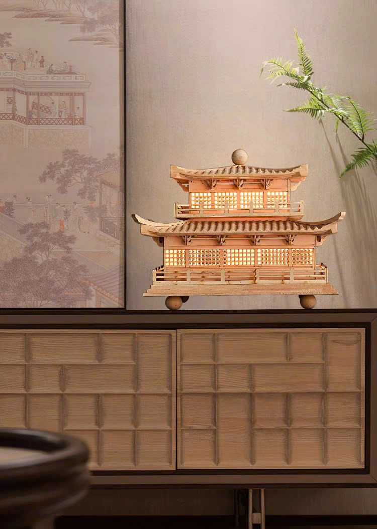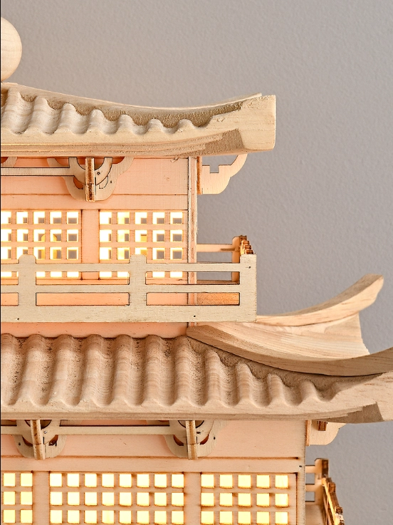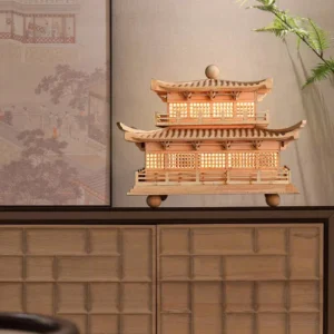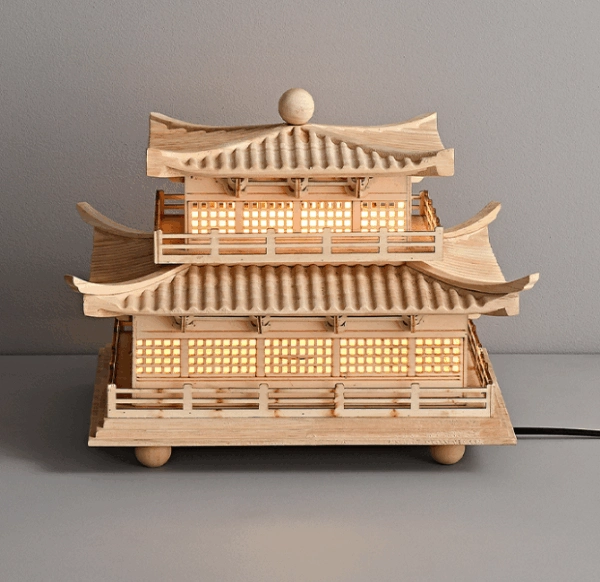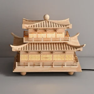 Đèn bàn gỗ Tùng Đăng là sự kết hợp tinh tế giữa tay nghề mộc truyền thống và phong cách thiết kế lấy cảm hứng từ kiến trúc đình, chùa cổ phương Đông. Từng đường nét, mái ngói cong vút, ban công nhỏ xinh đều được chế tác tỉ mỉ, tạo nên một tác phẩm vừa là đèn trang trí vừa là kiệt tác nghệ thuật.